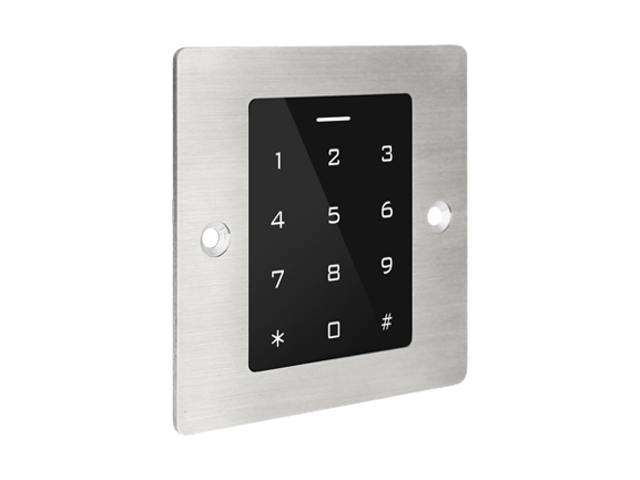 - Flush-mounted keypad, with backlit touch screen combined with a proximity card reader