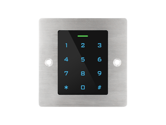 - Flush-mounted keypad, with backlit touch screen combined with a proximity card reader